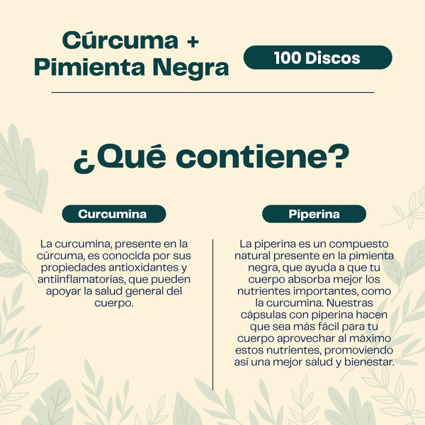 ¿Sientes que la inflamación y el cansancio te limitan día a día? Nuestra fórmula de cúrcuma con pimienta negra en prácticos discos sólidos es tu solución natural. Esta poderosa combinación no solo reduce la inflamación de manera efectiva, sino que también apoya la digestión, fortalece tu sistema inmune y favorece la salud articular y del hígado, gracias a la curcumina potenciada por la pimienta negra.