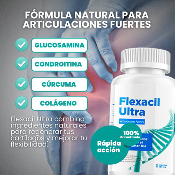 Imagina poder caminar, entrenar, subir escaleras o simplemente disfrutar de tus actividades diarias sin que el dolor o la rigidez articular te detenga. Flexacil Ultra – Articulaciones Fuertes te ofrece una solución integral: con solo dos cápsulas al día, una antes del desayuno y otra antes del almuerzo, tu cuerpo recibe los nutrientes necesarios para regenerar el cartílago, reducir inflamaciones y fortalecer los tejidos conectivos.