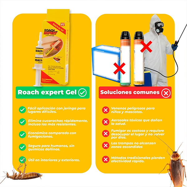 El Roach Expert Gel mata cucarachas es mucho más que un simple insecticida: es la solución definitiva para eliminar cucarachas y otras plagas de manera rápida, efectiva y completamente discreta. Su fórmula profesional actúa directamente sobre los nidos, atacando a toda la colonia desde la raíz, lo que garantiza resultados duraderos y un hogar libre de estas molestas invasoras.