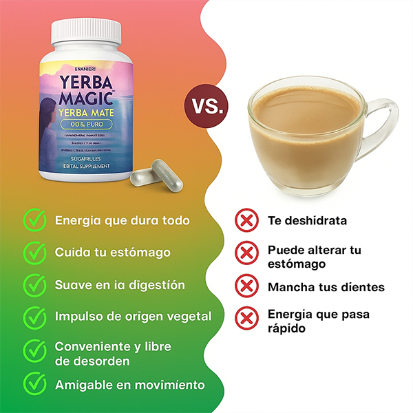 Con Yerba Magic 60 Cápsulas es posible. Solo necesitas tomar de 1 a 2 cápsulas al día con agua, antes de tus comidas principales, para sentir cómo tu cuerpo elimina toxinas, acelera el metabolismo y controla el apetito de forma natural. Imagina despertar más ligero, con menos pesadez y con la vitalidad que necesitas para rendir al máximo. Todo en una cápsula práctica, natural y efectiva.